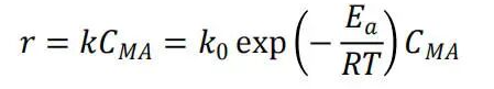 Where kis the reaction rate constant, and C_MA is the concentration of maleic anhydride. k = k₀* exp(-Ea/(R*T)), where k₀is the pre-exponential factor, Ea is the activation energy, Ris the ideal gas constant, and T is the absolute temperature.